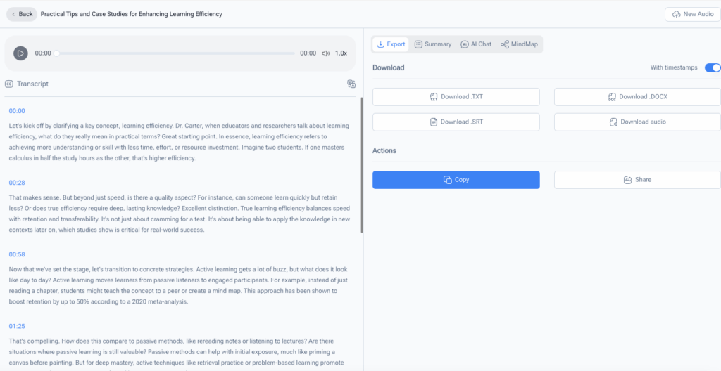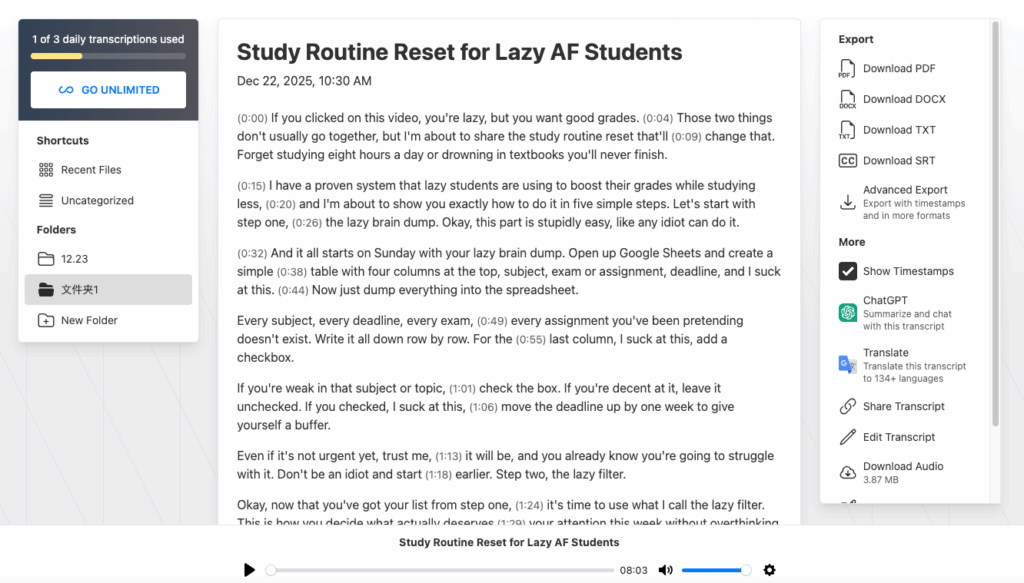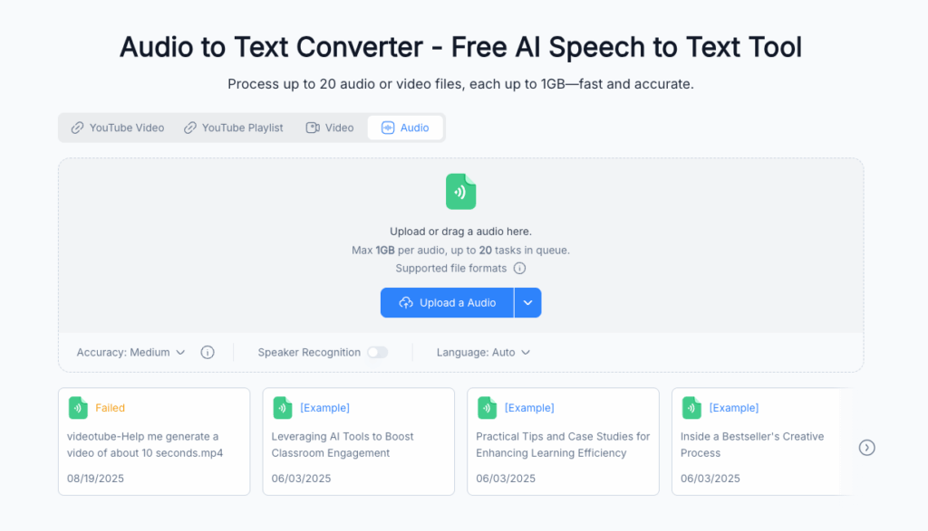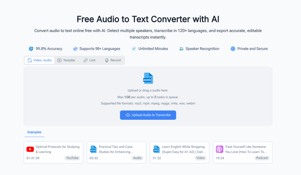 Using it is a breeze: just upload your audio file, click “transcribe,” and wait a few minutes. The free version lets you transcribe up to 60 minutes monthly, perfect for casual use. The only downside? No multilingual transcription, so it’s best for English audio. If you need a free audio to text converter that works with your note-taking routine, NoteGPT is the one to beat.