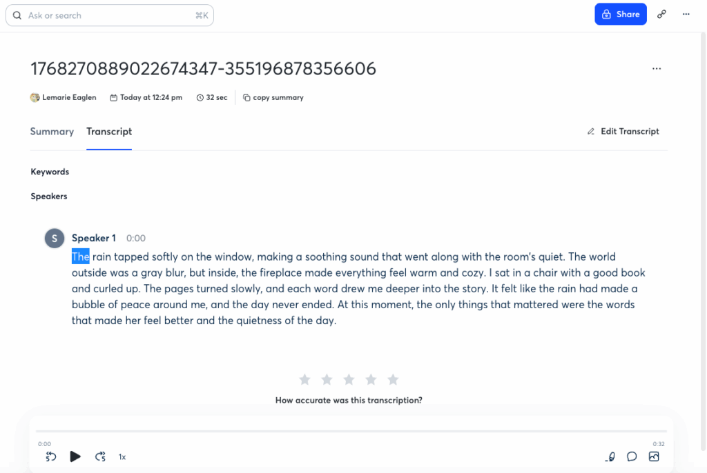 It also offers fast transcription (a 30-minute file takes about 6 minutes) and full online convenience. No downloads or installations needed; just use it directly in your browser. Accuracy is 90% for clear audio, and it handles mild background noise decently.